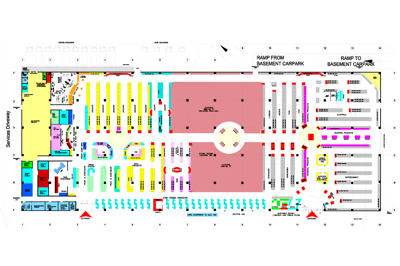 Our brief was to create hypermarket design blueprints for 7,500-square metre and 4,500-square metre stores, on one level, encompassing the following areas:
