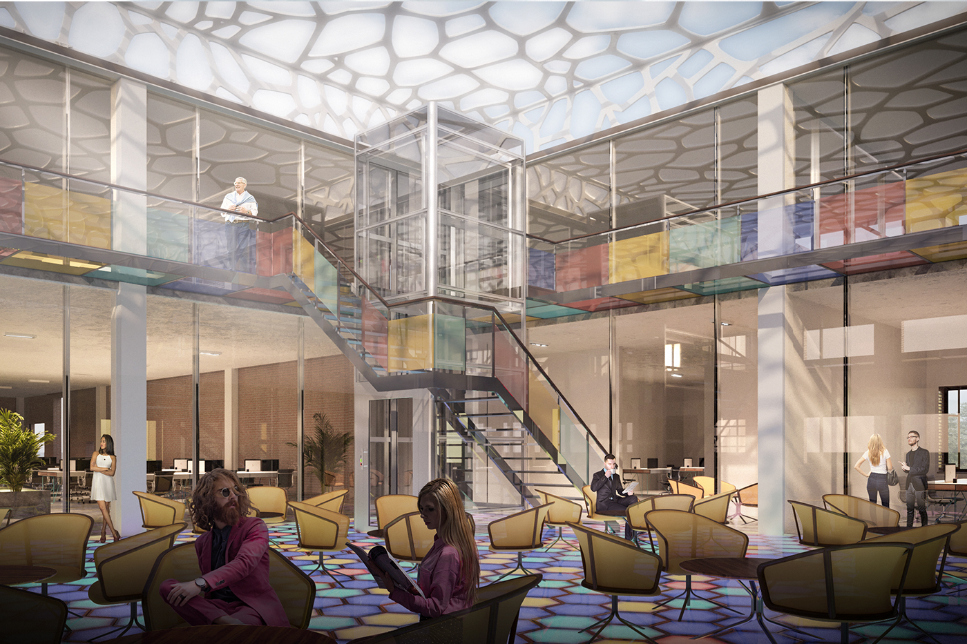 The proposal inserts three new double-height spaces: the first linking a new staff entrance to the main reception, the second a ’break-out’ space at ground floor level, overlooked by a coloured glass balcony at first floor level, and located centrally within the building floor plate. Together, these bring natural daylight into the deep plan office floor plate and social spaces in the building.